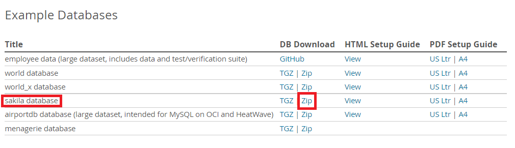 1. 아래의 주소로 접속하여 예제 데이터베이스에서 샤키라 데이터 베이스 파일을 내려받는다.