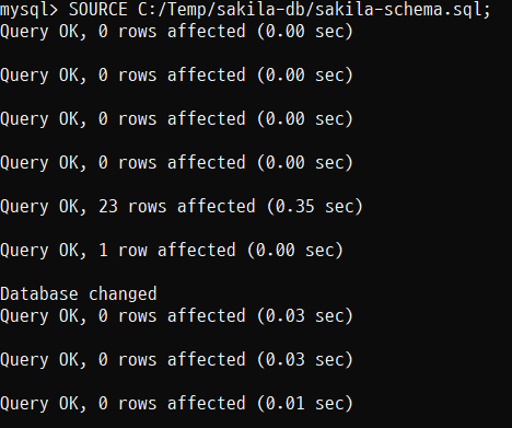 4. SOURCE C:/Temp/sakila-db/sakila-schema.sql; 을 입력하고 [Enter]를 누른다.